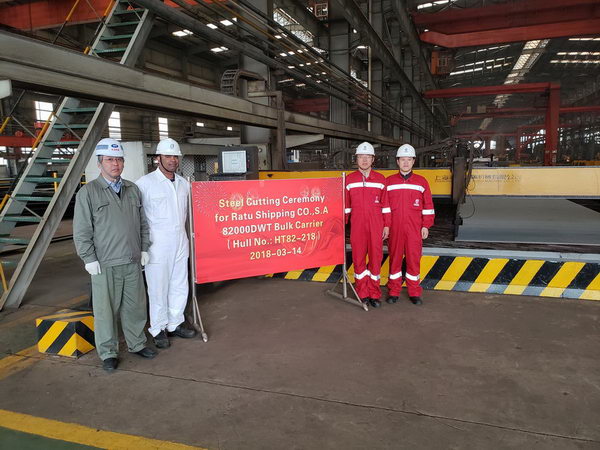 2018年3月14日,我司為日新船東建造的82000噸散貨輪(船體號:HT82-218)正式開工,該船入BV船級社。公司領導、船東、船檢代表參加該儀式。