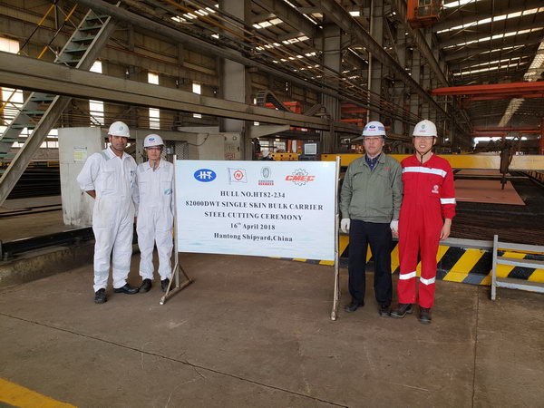 2018年4月16日,我司為日本NISSIN船東建造的82000噸散貨船(船體號(hào):HT82-234)正式開(kāi)工,該船入BV船級(jí)社。公司領(lǐng)導(dǎo)、船東、船檢代表參加該儀式。