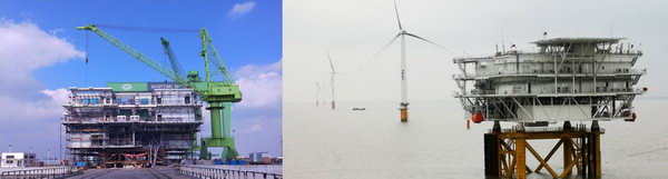 剛交付的龍源大豐(H7)海上風電場200MW級220KV升壓站,采用整體式布置,平面尺寸約為53.2m×42m,總重約為3100噸。內部安裝有電氣、消防、暖通及各類內裝等100余項專業設備。韓通贏吉承擔了該項目的生產設計、采購、建造運輸安裝、調試及海上聯調交付等工作。該海上升壓站不僅是風電機組在發電后進行升壓并傳輸回陸地的一個重要平臺,而且也是風電場的控制中心和風電場的海上應急處理場所。