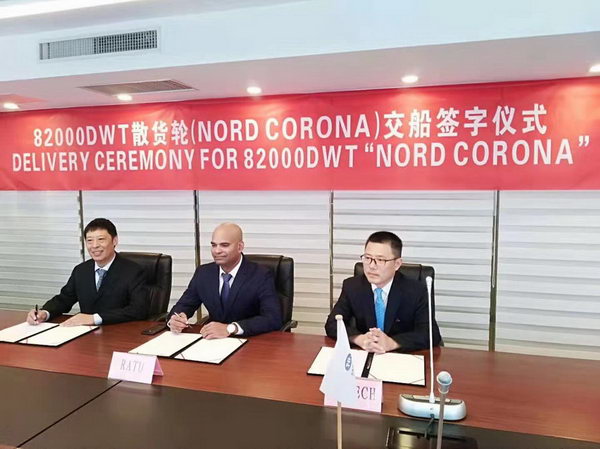 2019年9月27日,韓通船舶重工為日本日新公司建造的第四艘82000噸系列散貨輪又迎來(lái)了新的節(jié)點(diǎn),順利簽字交船。