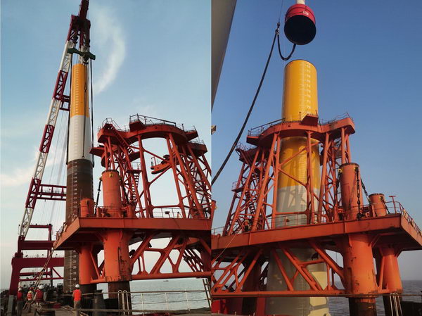 2019年10月28日早晨6點58分,由海洋水建“海洋52”、“亞龍66”和IHC-S2000組成的裝備組順利完成了龍源射陽(H2)海上風電項目(二標段)首根5#機位的沉樁施工。歷時2小時08分,總錘擊數1600錘,最后25cm灌入度24錘,(平均灌入度10.42mm),水平度千分之一點二七。10月30日,海洋水建大豐項目部再次把6#機位的基礎沉樁就位,標志著龍源射陽(H2)項目全面拉開了建設序幕,為項目后序施工工作快速推進打下了堅實的基礎。