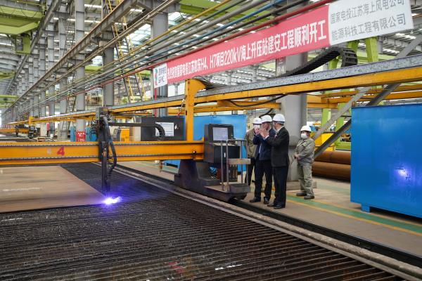 儀式在國家電投集團江蘇海上風力發電有限公司王勝利總經理和南通市海洋水建工程有限公司鄭錫山總經理聯手按下切割點火按鈕并開滿鋼花的氛圍中圓滿結束。