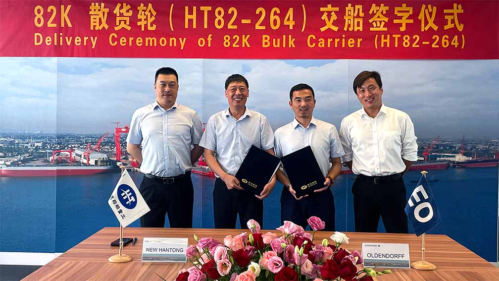 2023年7月31日,韓通為德國OLDENDORFF船東建造的82000噸散貨輪 “PENGLAI”(船體號:HT82-264)順利簽字交付。 HT82-264為系列船中的第6艘船,是航運市場主流的散貨船船型,也是公司的拳頭產品之一,入LR船級社。該船總長229米,型寬32.26米,型深20.35米,設計吃水12.2米,設計航速14.0節,具有油耗低、綠色環保、適應性能強、節能高效等諸多優點。