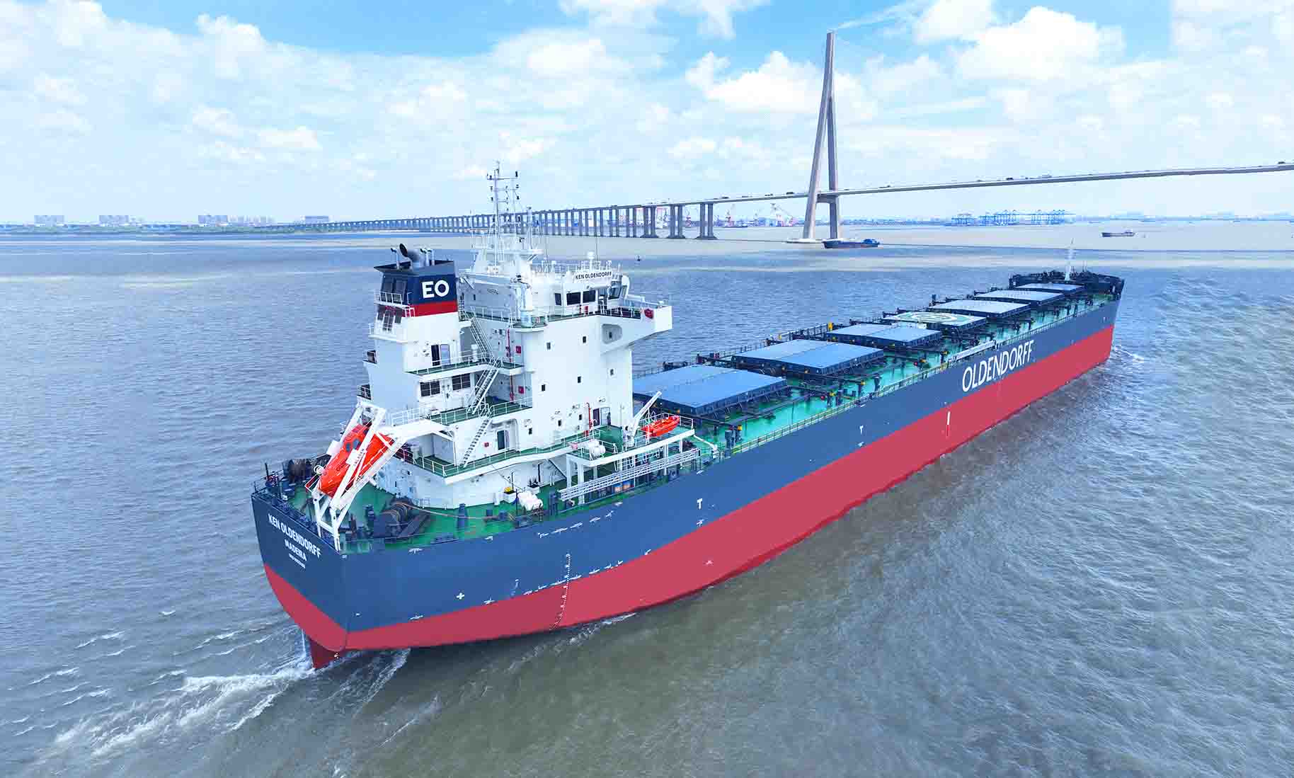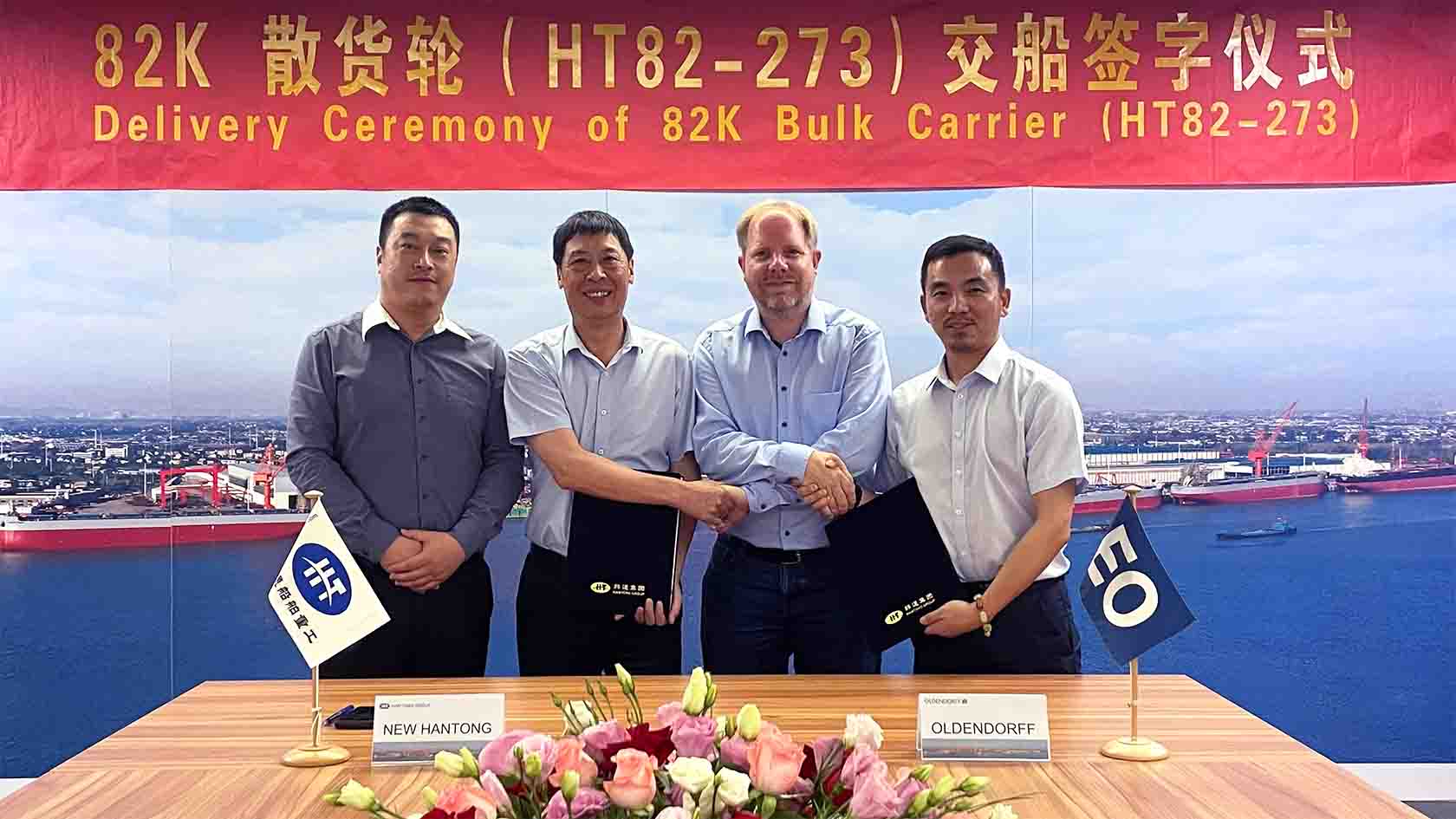 2023年9月5日,在大家的共同見證下,韓通為德國OLDENDORFF船東建造的82000噸散貨輪 “KEN OLDENDORFF”(船體號:HT82-273)順利簽字交付,該船于9月3日在公司碼頭成功舉行了命名儀式。HT82-273是系列船中的第7艘,也是韓通交付給OLDENDORFF的第26艘,屬于目前航運市場主流的散貨船船型,也是公司的拳頭產品之一,入LR船級社。