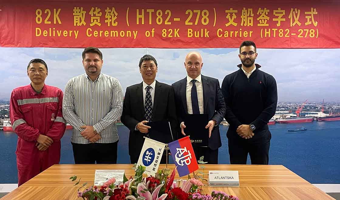 2024年1月4日,韓通為克羅地亞Atlant Kamsarmax II Corporation船東建造的82000噸散貨輪“AP LOVRIJENAC”(船體號:HT82-278)成功簽字交付。
