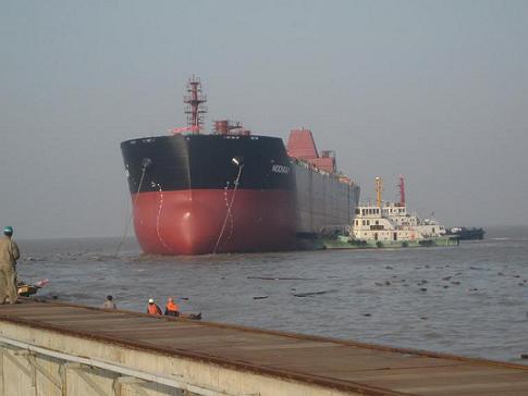 迎著4月最后一天的霞光,57000DWT散貨輪(HT003)在韓通船舶重工的1#船臺2號滑道順利下水,該船為希臘PRIMARY建造,入BV級.由江蘇蘇美達船舶公司代理.在同一天,另一條57000DWT散貨輪(HT004)在同一船臺舉行了上臺儀式,該船為希臘NGM建造,是該系列船的第4艘船.從該船HT003開始,建造工藝采用上層建筑整體吊裝工藝.