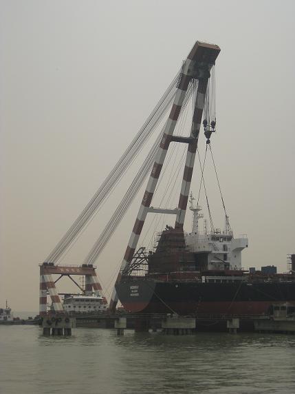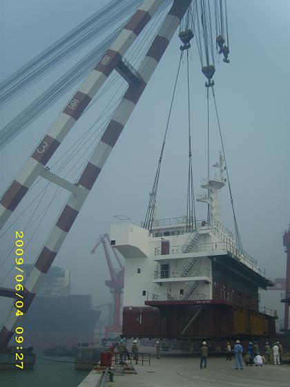 2009年6月4日、5日兩天,57000噸散貨輪(船體號HT003、HT012)上建吊裝在韓通重工圓滿完成。本次吊裝利用穩強3號浮吊進行上建整體吊裝。高層領導對此次工藝改進高度重視,全程現場跟蹤指導。