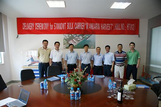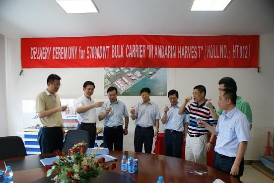 2009年7月17日上午9:00,在江蘇韓通船舶重工6號會議室舉行了57000DWT(船號:HT012)散貨輪交船儀式。該船由中航技廈門公司代理,招商銀行廈門分行提供保函,入BV船級社;該船為韓通船舶重工有限公司為新加坡大新建造第一批6條船的最后一條船,也是韓通/新韓通從2008年6月份交船以來的第10條船;經過船東,船廠以及船級社的共同努力,該船按照合同計劃節點按時交付給船東.交船儀式后,雙方就今后的合作進行磋商并達成共識.大新船務公司總經理張蘭水先生,中航技廈門公司總經理黃光先生,招商銀行廈門分行行長柯先生,江蘇韓通船舶重工有限公司董事長孟成君先生、總經理武亦文先生以及各位嘉賓代表出席了該儀式。