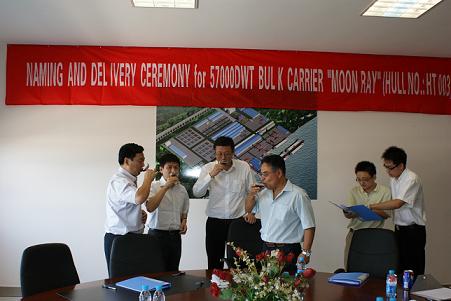2009年9月4日,中午13:00,我司為希臘船東建造的第三艘57000噸散貨輪(船體號:HT003)在韓通重工6#會議室成功交付。該船由SUMEC代理,入BV船級社。Mirage Finance Inc.駐廠經理Panayotis Yannoutsos,SUMEC總經理田鳴,江蘇韓通船舶重工有限公司董事長孟成君先生、總經理武亦文先生,副總經理陳興以及各位嘉賓代表出席了該儀式。整個交船儀式沉浸在喜欣的氣氛之中,儀式最后大家舉杯歡慶、合影留念。