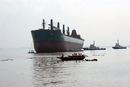 同天下午15:00,PD項目系列船的第三艘57000噸散貨輪(HT018),在韓通重工2號船臺順利下水。