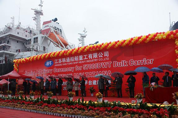 2009年11月16日上午,我公司為德國船東建造的57000噸散貨輪(HT018)在韓通碼頭舉行了交船儀式,該散貨輪為PD系列船的第三艘,2009年9月4日在韓通2號碼頭順利下水,11月7日圓滿完成各項測試凱旋歸來。