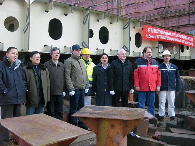 我司為德國船東建造的57000噸散貨輪(船體號HT023)于2009年12月19日上午9:30在我司1號船臺2號滑道舉行上臺儀式,該船入英國勞氏船級社。船東SPLOSNA PLOVBA公司董事局主席EGON BANDELJ一行,陳興副總,PD項目駐場經理Babic,英勞船級社駐場經理王谷正和貿易公司弘業參加了該儀式。