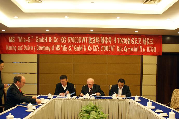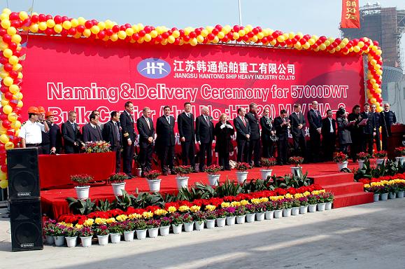 2010年1月29日,韓通船舶重工有限公司為Schepers公司建造的第二艘57000噸散貨輪(HT020)達(dá)到了交船狀態(tài),在韓通重工碼頭為該艘舉行隆重的命名及交船儀式。Schepers航運(yùn)公司 Rudolf Schepers 先生和Jan Schepers先生、圣母凱特琳· Schepers女士、中國(guó)航空技術(shù)廈門有限公司船舶部經(jīng)理林昱先生、英國(guó)勞氏船級(jí)社中國(guó)中部地區(qū)技術(shù)總監(jiān)杰弗· 凱夫先生、江蘇韓通船舶重工有限公司總經(jīng)理武亦文先生共同見證了這一激動(dòng)人心的時(shí)刻,并發(fā)表了精彩的演講。隨后是船舶行業(yè)古老而傳統(tǒng)的砸香檳儀式。它在國(guó)外由來(lái)以久,飽含著祝福和祈禱,預(yù)示著平安和吉祥。在大家倒數(shù)聲中,圣母凱特琳· Schepers女士砍斷纜繩,香檳四濺,音樂響起,禮花飛舞,鞭炮燃放,全場(chǎng)人員熱烈鼓掌。最后由武總帶領(lǐng)各嘉賓上船參觀。