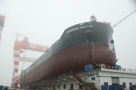 57000噸散貨輪一艘(船體號HT032)下水、一艘(船體號HT048)上臺