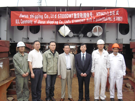 我司為寶源國際有限公司建造的57000噸散貨輪(船體號HT067)于2010年5月8日早上11:00在我司2號船臺舉行了上臺儀式。該船入BV船級社。