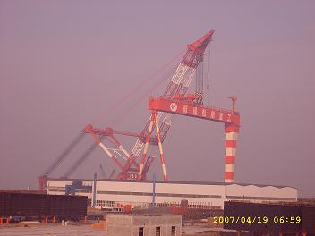 4月18日,為3號船臺配套的第一臺200噸門吊吊裝完成,并進(jìn)入調(diào)試階段,在5月底投入使用;3號船臺是專用海洋工程平臺,第一座SEVAN 300將在上面完成合攏后下水。門吊由格雷特總包,韓通提供鋼結(jié)構(gòu)的制作,吊裝由上海振華港機(jī)的1800噸的浮吊完成。第二個(gè)門吊已經(jīng)進(jìn)入制作階段,將在6月份吊裝。