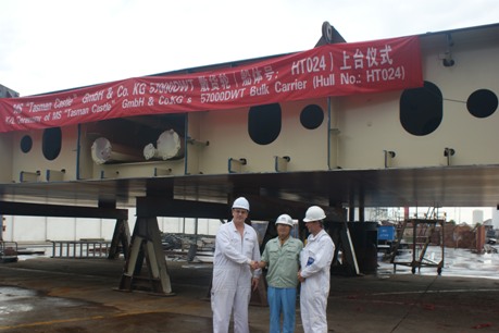 我司為Peter Doehle建造的57000噸散貨輪(船體號HT024)于2010年8月31日下午16:00在我司1號船臺舉行了上臺儀式。該船入LR船級社。李繼念副總,船東代表參加了該儀式。