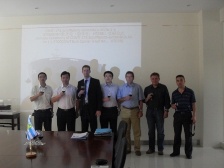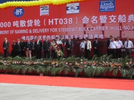 2010年9月7日江蘇新韓通船舶重工有限公司迎來了又一個值得慶祝和紀念的日子—HT038的命名及交船儀式。該57000DWT散貨輪為我司為德國CONTI 船東建造并交付的第二條散貨輪,該船被命名為“POS ALEXANDRIT”. CONTI 船東副總裁奧布梅拉先生和監造公司BBG董事霍倫巴克先生和英國勞氏船級社中國區經理Alan Swinbank 和Alan Williams參加了該儀式并發表講話。儀式結束后,船東船檢代表等參觀了該船,并給予很高的評價。2010年9月8日下午2:00在新韓通會議室簽訂了該船的交船文件。至此,該船成功交付。