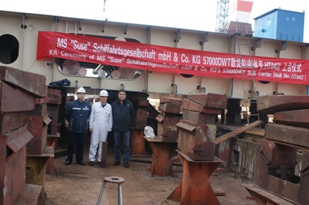 我司為德國船東建造的57000噸散貨輪(船體號:HT043)于2010年11月23日上午10:00在我司1號船臺舉行了上臺儀式,該船入LR船級社,計劃2011年4月30日交船。陳林軍常務副總及船東船檢代表參加了該儀式。