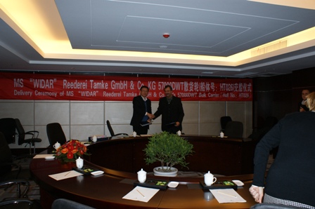 2011年1月6日,江蘇韓通船舶重工有限公司為PD建造的57000噸散貨輪(HT026)達到了交船狀態,該船入英國勞氏船級社,被命名為“Widar”。下午4點,在文景會議室總經理武亦文先生與船東 Dirk Tamke先生簽訂了該船的交船文件。至此,該船成功交付。
