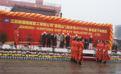2011年1月18日下午下起了南通今年第一場雪,在韓通2號船臺舉行的57000噸散貨輪(船體號HT078)下水命名儀式上,船東代表戴加火先生盛贊該船的建造團隊。“江蘇韓通船舶重工有限公司有能力建造堅固、可靠的船舶,我們堅信眼前這艘57000噸散貨輪的建造質量符合要求。”