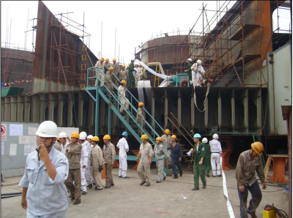 為了有效地應(yīng)對突發(fā)事件, 二零零七年八月三日, 韓通船舶重工組織了在建項目H021-Sevan 300 #4 FPSO 的緊急撤離及消防演習(xí), 與該項目有關(guān)的150人參與了演練。