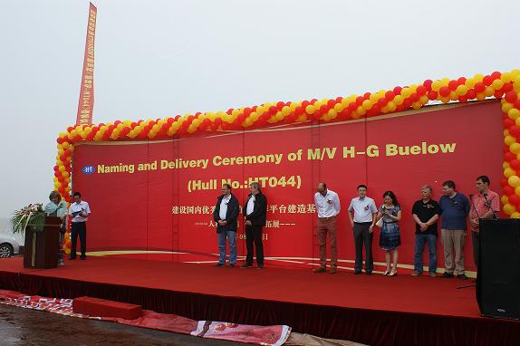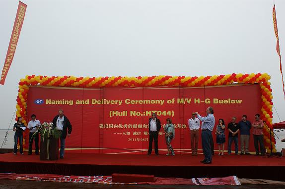 我司為PD建造的57000噸散貨輪(HT044)達到了交船狀態,2011年8月18日在江海碼頭舉行了隆重的命名及交船儀式,被命名為“H-G BUELOW”。該船入英國勞氏船級社。儀式結束后,船東船檢代表等參觀了該船,并給予很高的評價。至此,該船成功交付。
