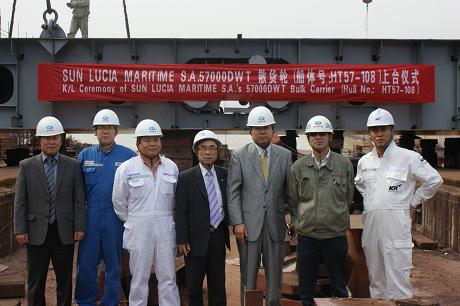 我司為韓國現代船東建造的57000DWT散貨輪(船體號:HT57-108)于2011年10月15日上午9:00在我司1號船臺舉行了上臺儀式,該船入KR船級社。潘學軍副總及船東船檢代表參加了該儀式 |