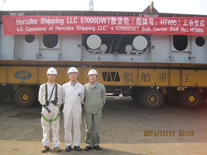 我司為Eagle Bulk船東建造的57000DWT散貨輪(船體號:HT095)于2011年11月11日上午10:00在我司1號船臺舉行了上臺儀式,該船入LR船級社。李繼念副總及船東船檢代表參加了該儀式。