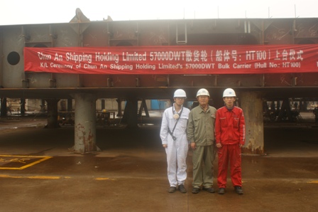 我司為 春安 船東建造的57000DWT散貨輪(船體號:HT100)于2011年12月21日上午10:00在我司1號船臺舉行了上臺儀式,該船入NK船級社。李繼念副總及船東船檢代表參加了該儀式。