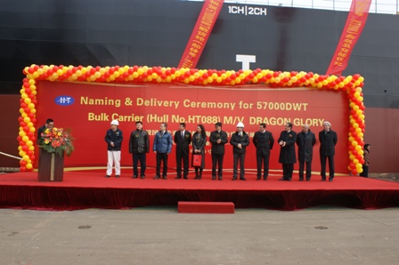 2012年3月9日,韓通船舶重工有限公司為DA SIN公司建造的57000噸散貨輪(HT088)達(dá)到了交船狀態(tài),在韓通重工碼頭為該船舉行隆重的命名及交船儀式,該船入LR船級(jí)社,被命名為“DRAGON GLORY”。 儀式結(jié)束后,船東船檢代表等參觀了該船,并給予很高的評(píng)價(jià)。至此,該船成功交付。