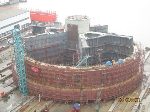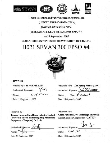 二零零七年九月十五日是韓通重工的雙喜日,船廠迎來了同一天完成Sevan300 FPSO(H021)兩個節點的目標: