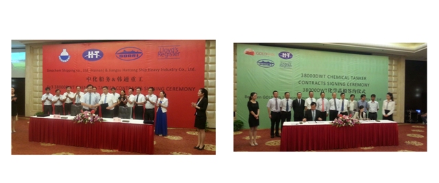 2014年8月8日,我司與中化船務簽訂4+3、香港金威船東簽訂1+2 38K不銹鋼化學品船訂單,該批訂單將于2016年下半年起陸續交付,該船型由SDARI設計。這是我司繼承接20.8萬載重噸散貨輪后,在船型大型化,技術附加值更高產品上邁出的又一里程碑。