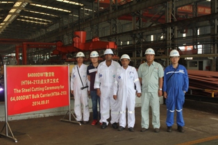 2014年9月1日,我司為FLEET 船東建造的64000噸散貨輪(船體號:HT64-231)開工儀式在韓通新船體車間順利舉行,該船入DNV.GL船級社。周義慶副總經理及船東、船檢代表參加該儀式。