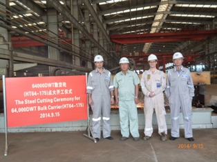 2014年9月15日,我司為 CONTI船東建造的64000噸散貨輪(船體號:HT64-175)開工儀式在韓通新船體車間順利舉行,該船入LR船級社。周義慶副總經理及船東、船檢代表參加該儀式。