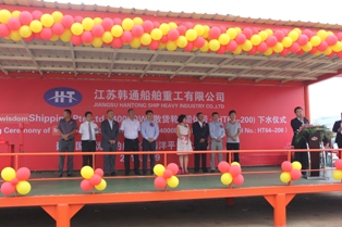 2014年9月29日江蘇韓通船舶重工有限公司迎來(lái)了又一個(gè)值得慶祝和紀(jì)念的日子—HT64-200命名及下水儀式。我司為大新船東建造的64000DWT散貨輪(HT64-200)在韓通1號(hào)船臺(tái)順利下水,入BV船級(jí)社。周義慶副總經(jīng)理,船東代表及船級(jí)社代表參加該儀式。