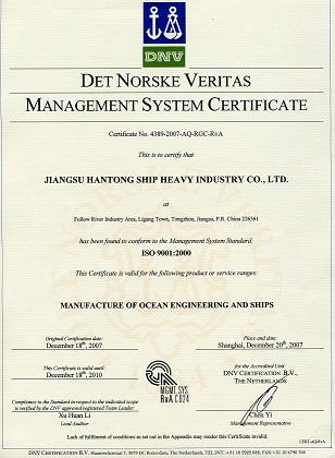 2008年1月,韓通船舶重工有限公司收到DNV簽發(fā)的ISO9000的證書,是目前通過DNV認證的少數(shù)船廠之一。DNV相對于其他認證機構來說,比較嚴格和規(guī)范,對促進企業(yè)的發(fā)展提高是由極大的幫助的,同時也提升了企業(yè)的管理水平。