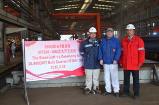 2015年2月2日,我司為德國PD船東建造的38800噸散貨輪(船體號:HT388-168)開工儀式在韓通新船體車間順利舉行,該船入LR船級社。周義慶副總經理及船東、船檢代表參加該儀式。