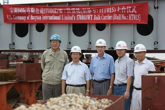 7月11日,在韓通船舶重工有限公司的1號船臺舉行了57000噸散貨輪的上臺儀式,該船為香港寶源國際建造,入LR級,是該船東在韓通建造4艘系列船的首制船。武亦文總經理(韓通),劉庚寶董事長(寶源國際)以及LR船級社的代表參加儀式。