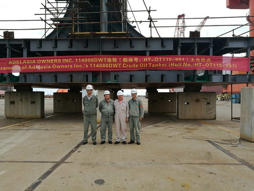 2016年10月10日,我司為TMS TANKERS公司建造的115000噸油輪(船體號:HT-OT115-001)舉行上臺儀式,該船入ABS船級社。公司領導、船東代表參加該儀式。
